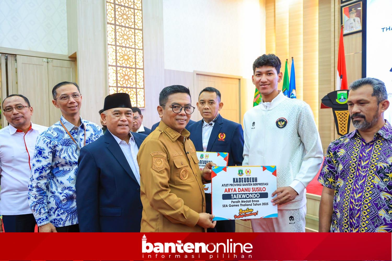 SERANG, –Gubernur Banten Andra Soni mengapresiasi para atlet asal Banten yang tampil di SEA Games 2025 Thailand dan Pekan Olahraga Mahasiswa Nasional (Pomnas) 2025. Apresiasi itu disampaikan saat silaturahmi dengan para atlet di Pendopo Gubernur Banten, Kota Serang, Kamis (12/3/2026).