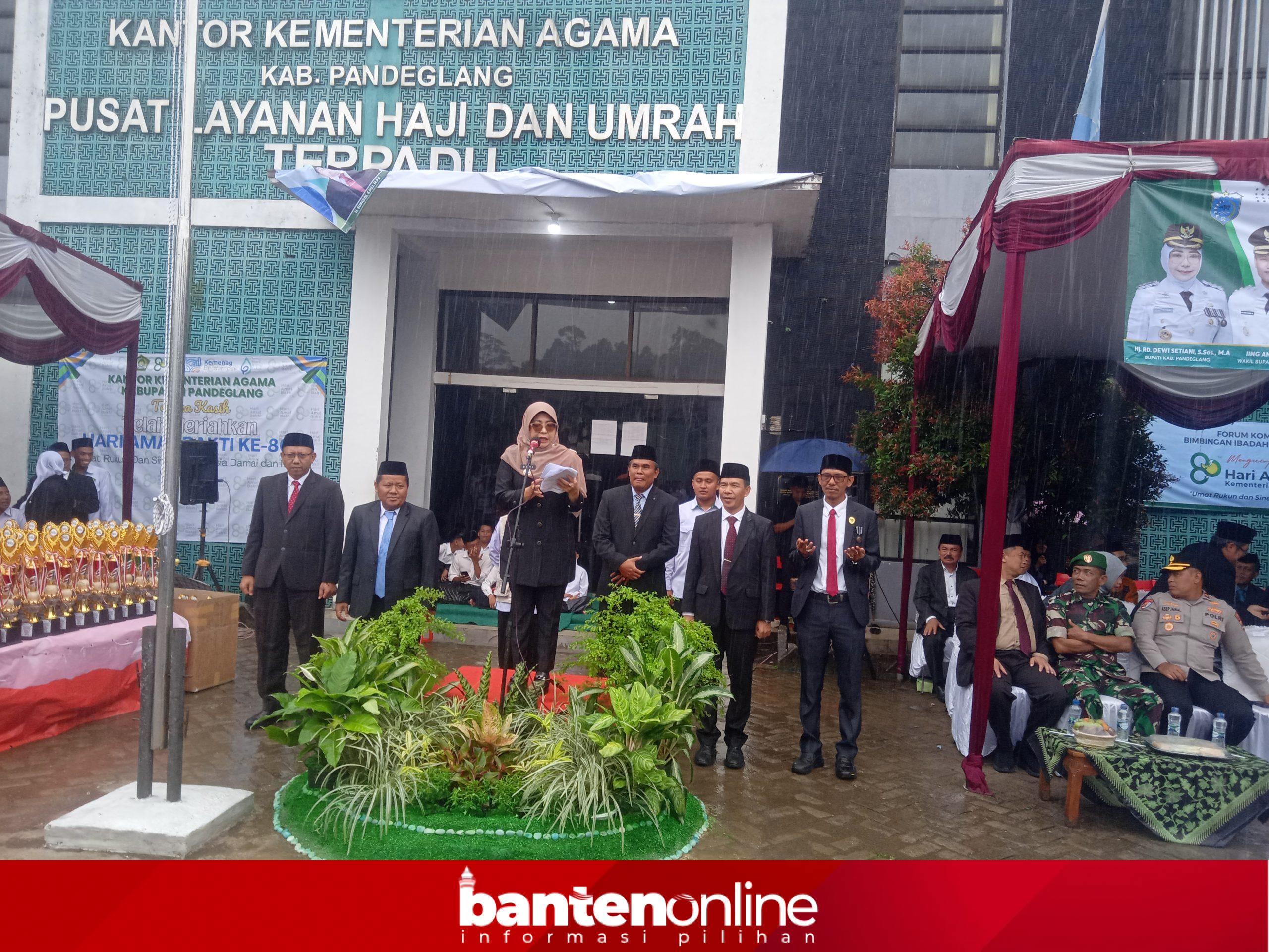 Bupati Dewi bertindak sebagai inspektur upacara. Hujan yang turun tidak menghambat jalannya upacara. Kepala Kemenag Pandeglang beserta jajaran tampak tetap mengikuti rangkaian kegiatan dengan berdiri di belakang bupati di tengah hujan.