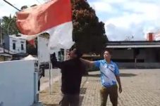 Satpol PP Pandeglang Turunkan Bendera Merah Putih Lusuh di Depan Gedung Juang 45