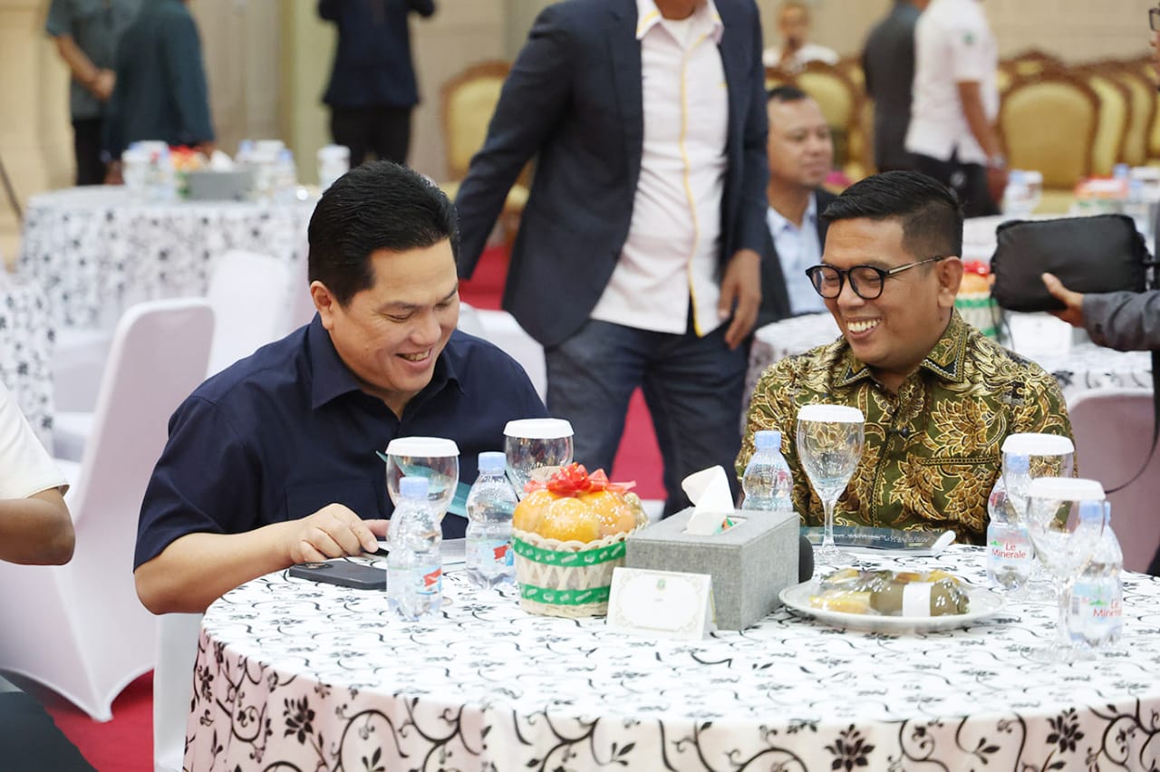 Gubernur Banten, Andra Soni menerima kunjungan kerja Ketua Umum PSSI yang juga Menteri BUMN Republik Indonesia Erick Thohir di Aula Pendopo Kantor Gubernur Banten, KP3B, Kota Serang, Jumat (22/8/2025). Pertemuan itu membahas pengembangan Kawasan Sport Center Provinsi Banten sekaligus arah pembangunan sepak bola nasional.