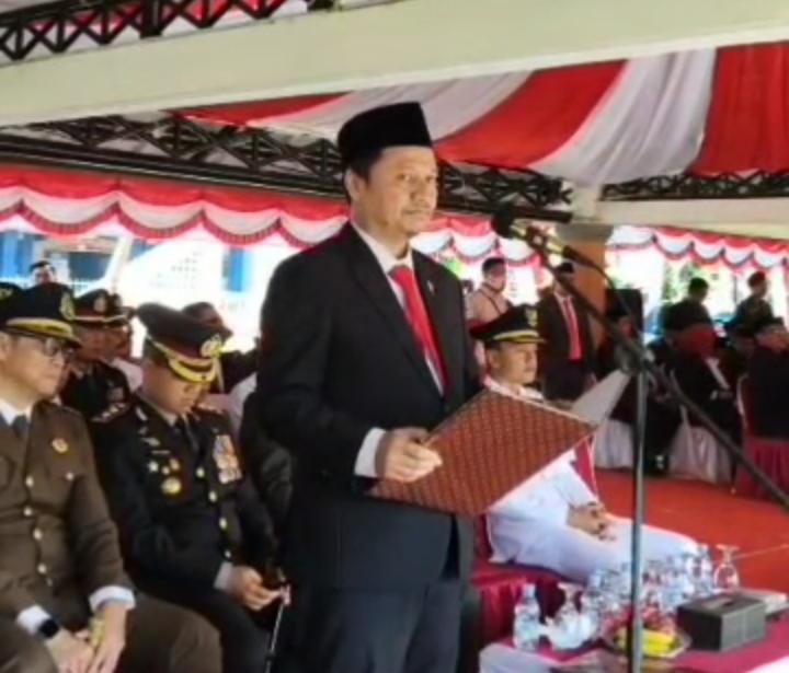 Di detik-detik Proklamasi Kemerdekaan Republik Indonesia, Ketua DPRD Pandeglang Tb.Agus Khotibul Umam membacakan teks Proklamasi dengan penuh penghayatan pada Upacara HUT Kemerdekaan RI ke-80 di Alun-alun Pandeglang, Minggu (17/08/2025).
