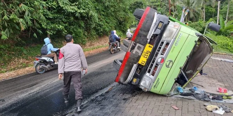 PANDEGLANG, – Sebuah truk bermuatan semen terguling di Jalan Raya Mandalawangi–Mengger, tepatnya di Kampung Cihideung, Desa Kurung Kambing, Kecamatan Mandalawangi, Kabupaten Pandeglang. Akibat kecelakaan itu, tiga orang mengalami luka ringan.