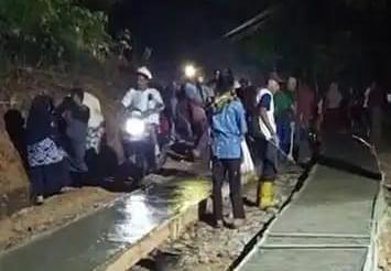 Aksi perbaikan jalan dengan coor beton tersebut dilakuan pada Selasa 22 Juli 2025 malam melalui gotong-royong warga setempat.
